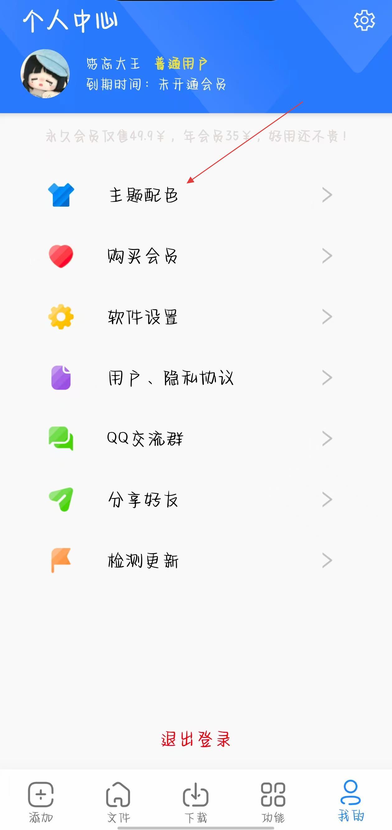 2、在個(gè)人中心頁面里,找到主題配色選項(xiàng)并點(diǎn)擊,進(jìn)入主題選擇界面。