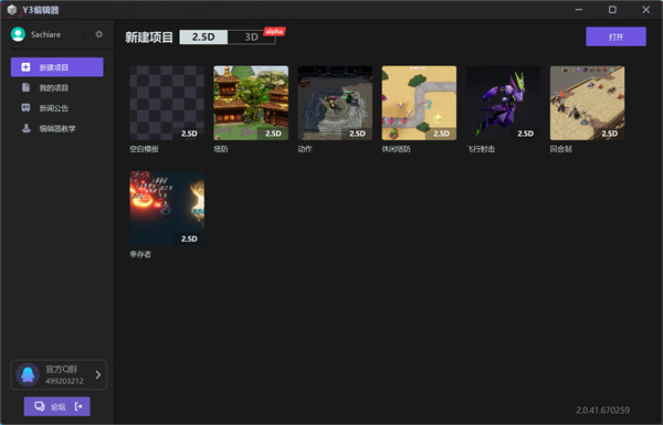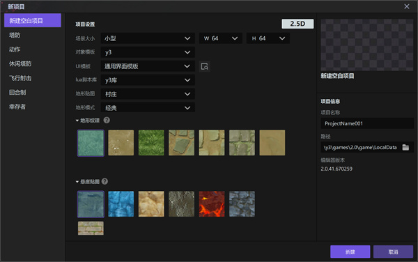 1、打開(kāi)編輯器就可以進(jìn)入到【新建項(xiàng)目】界面,在界面中我們可以選擇【2.5d、3d】?jī)煞N模式,點(diǎn)擊【空白模版】就可以進(jìn)入到創(chuàng)建項(xiàng)目詳情頁(yè)中;