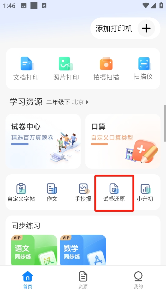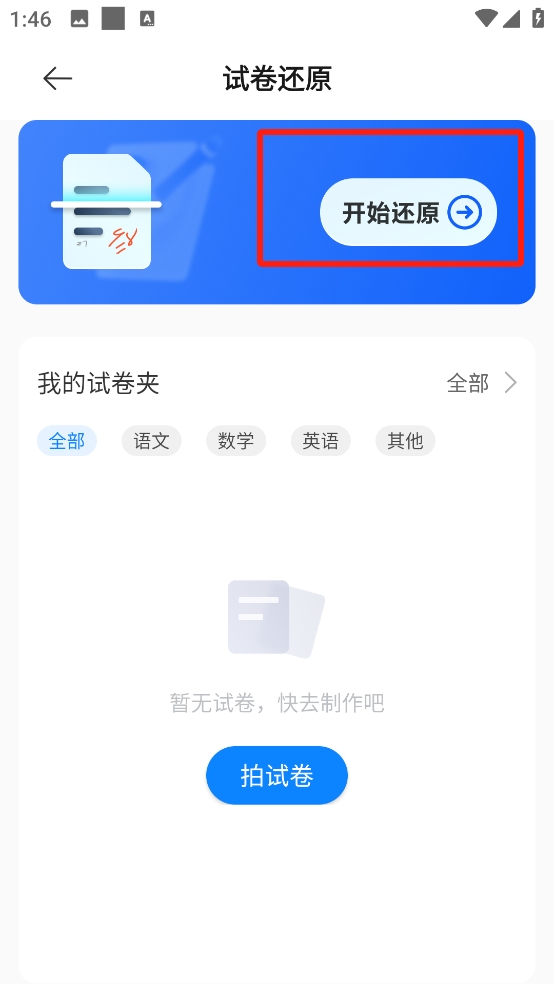 2、在首頁的頁面中找到試卷還原功能,對(duì)于已經(jīng)擁有字跡的試卷進(jìn)行還原;
