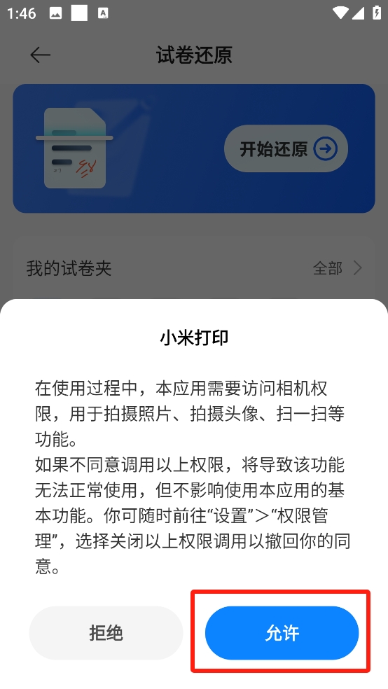 4、彈出提醒頁面新手第一次使用可以仔細(xì)閱讀,點(diǎn)擊允許后將自動(dòng)開啟拍照模式進(jìn)行試卷還原。