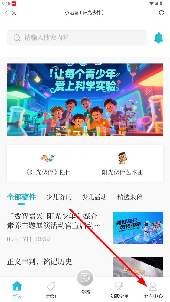3、進(jìn)入小記者陽光伙伴頁面后,點(diǎn)擊底部導(dǎo)航欄的個人中心。
