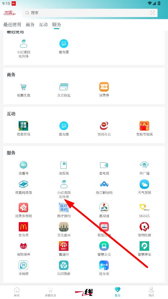 2、在服務(wù)界面里,找到小記者陽光伙伴點(diǎn)擊進(jìn)入相關(guān)頁面。