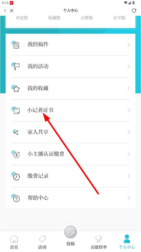 4、在個人中心界面中,點(diǎn)擊小記者證書選項,按后續(xù)提示操作領(lǐng)取小記者證。