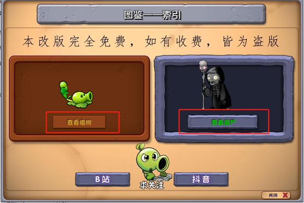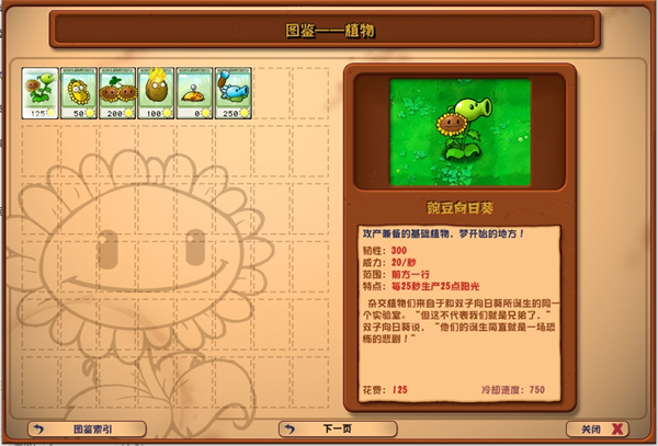 2、進(jìn)入圖鑒中將會(huì)看到圖鑒索引,左邊是所有植物圖鑒,右邊是所有僵尸圖鑒;