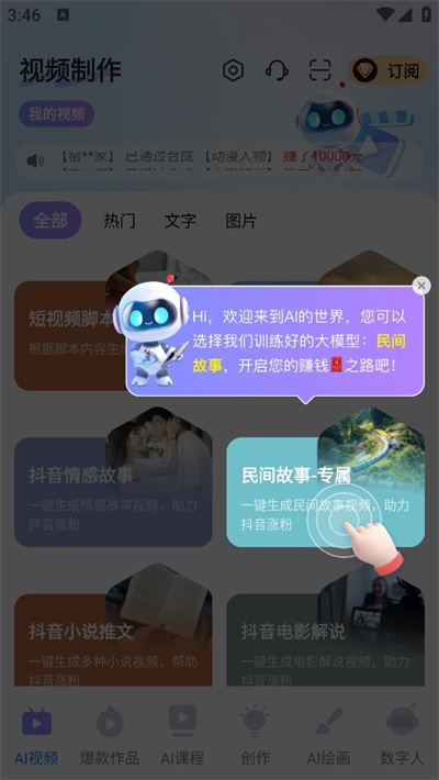 1、下載完畢后進(jìn)入頁(yè)面,將會(huì)看到新手指導(dǎo)教學(xué),以視頻制作下的民間故事為例;