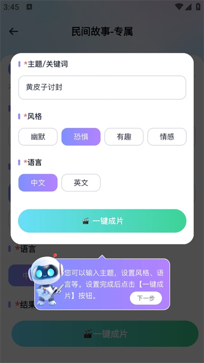 2、針對(duì)有著紅色*是必須要填寫(xiě)的,您可以輸入主題,設(shè)置風(fēng)格、語(yǔ)言等,設(shè)置完成后點(diǎn)擊【一鍵成片】按鈕;