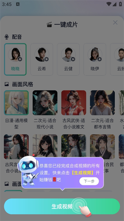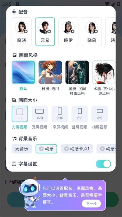 3、在這里您可以設(shè)置配音、畫(huà)面風(fēng)格、畫(huà)面大小、背景音樂(lè)、是否需要字幕等;