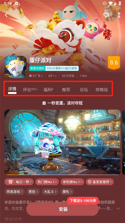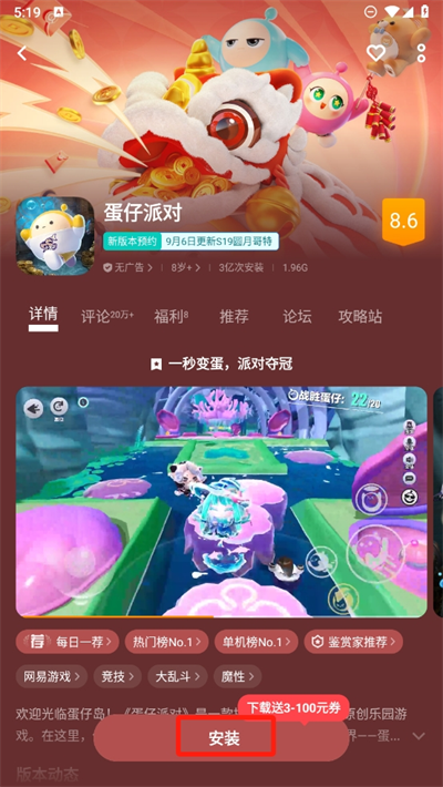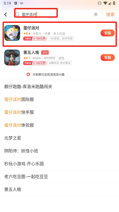 2、我們以蛋仔派對游戲為例,輸入后將會彈出該游戲的相關(guān)內(nèi)容,可直接安裝或點擊進入;