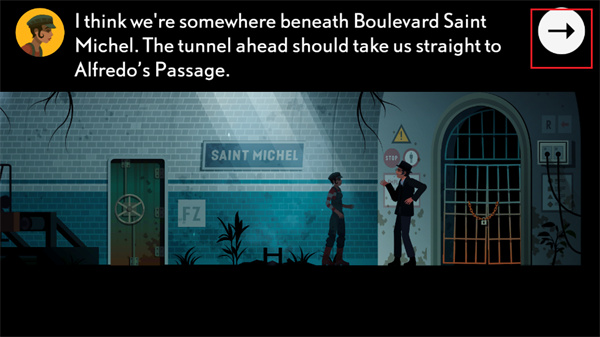 2、選擇好場景之后,玩家將會(huì)和自己的伙伴一起駕車來到一個(gè)陌生的地方,需要在這個(gè)地方進(jìn)行探秘,點(diǎn)擊上方的小箭頭來進(jìn)行對(duì)話的推進(jìn);