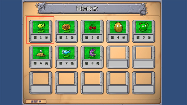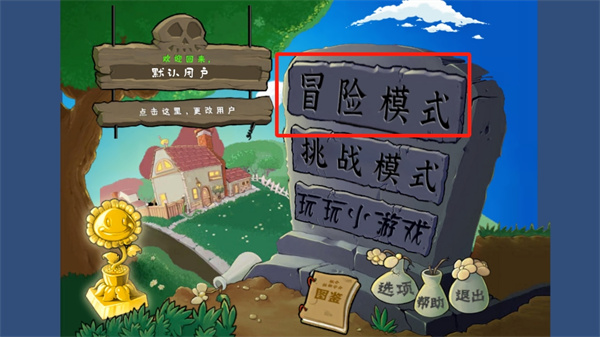 1、打開(kāi)游戲就會(huì)直接進(jìn)入到我們的主界面,在主界面中點(diǎn)擊【冒險(xiǎn)模式】開(kāi)啟我們的瘋狂植物之旅;