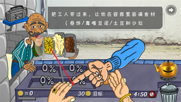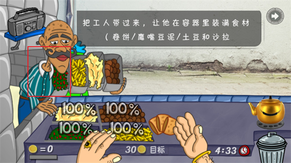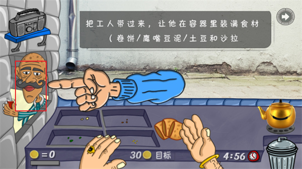 4、召喚出來工人后,需要從工人的手中進行小料的取用,將不同的小料放置到不同的盤子中,需要填滿盤子;