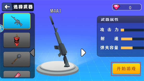 2、在這里選擇槍械、炸彈、瑯琊榜等武器,不同武器之間的攻擊力、射速等戰(zhàn)斗能力都不同,選擇喜歡的作戰(zhàn)武器模式點擊【開始游戲】操控當(dāng)前的武器加入戰(zhàn)斗;