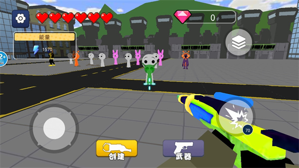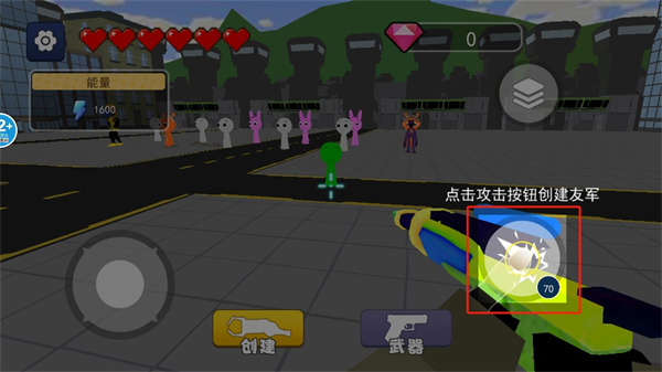 4、一群怪物聚集在一起極為具有壓力的戰(zhàn)斗,在這里跟隨著指示創(chuàng)建自己的隊友,組建出更多的應(yīng)對戰(zhàn)斗,應(yīng)核對前方的一眾敵人,點擊武器發(fā)射射出激光劍,瞄準敵人進行戰(zhàn)斗,成功的將敵人抵御在遠處;