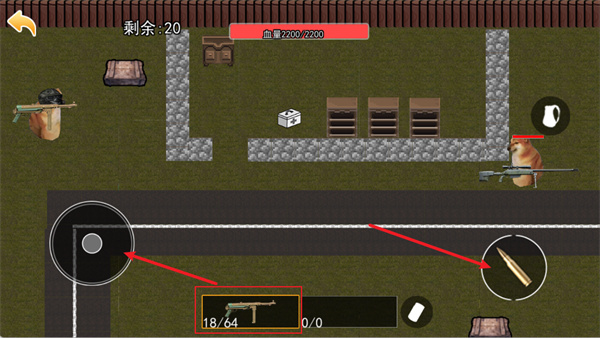 8、左側(cè)輪盤移動修狗,右側(cè)射擊按鈕可以使用剛才購買的槍械來攻擊敵人。