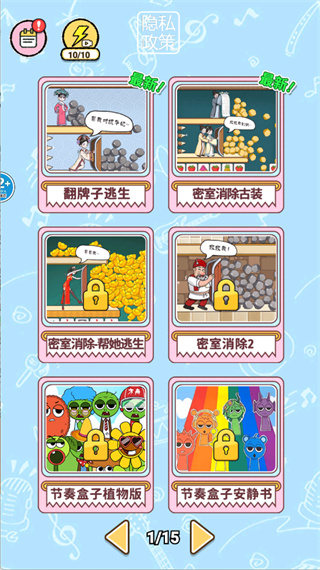 2、關(guān)卡眾多,比如翻牌子逃生、密室消除古裝、密室消除幫她逃生、密室消除2、節(jié)奏盒子植物版等;