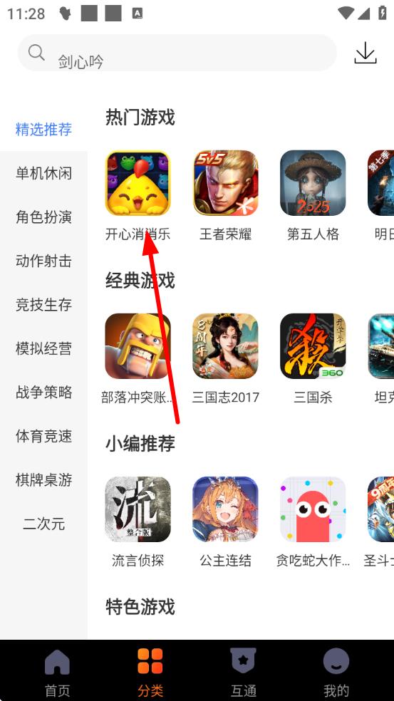 2、在分類頁面,可依據(jù)游戲類型如單機(jī)休閑等,快速定位想玩的游戲,像找到開心消消樂。
