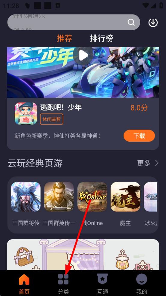 1、打開360游戲大廳APP,點(diǎn)擊底部導(dǎo)航欄中的分類,進(jìn)入游戲分類查找頁面。