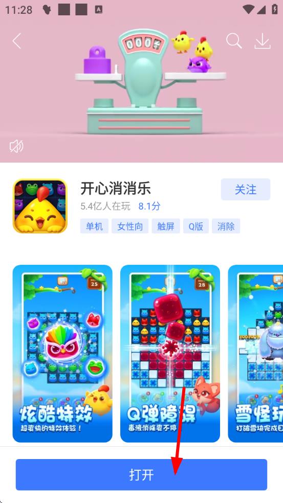 3、點(diǎn)擊目標(biāo)游戲開心消消樂進(jìn)入詳情頁,若已安裝,點(diǎn)擊下方打開按鈕,就能開始暢玩該游戲。