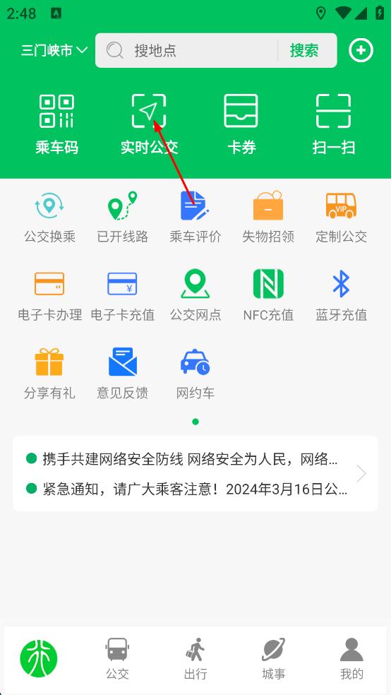 3、切換至“公交”頁(yè)面,在頂部功能欄找到“實(shí)時(shí)公交”選項(xiàng),點(diǎn)擊進(jìn)入,查詢公交實(shí)時(shí)位置、到站信息 。