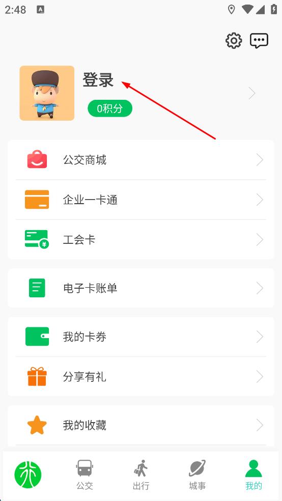 1、打開公交應(yīng)用,進(jìn)入“我的”頁(yè)面,點(diǎn)擊上方“登錄”區(qū)域,按提示完成賬號(hào)登錄,獲取積分等個(gè)人權(quán)益 。