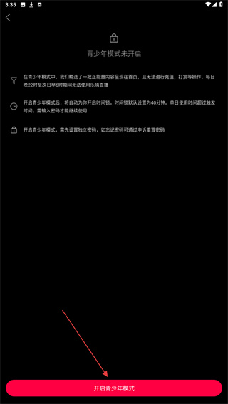 4、熟知青少年模式的規(guī)則后,點擊開啟的按鈕即可完成。
