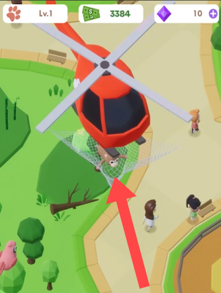 2、直升機(jī)下方的網(wǎng)兜中似乎有一只動(dòng)物,周圍有樹木、人物等元素,展現(xiàn)了游戲中通過直升機(jī)捕捉動(dòng)物的場(chǎng)景。