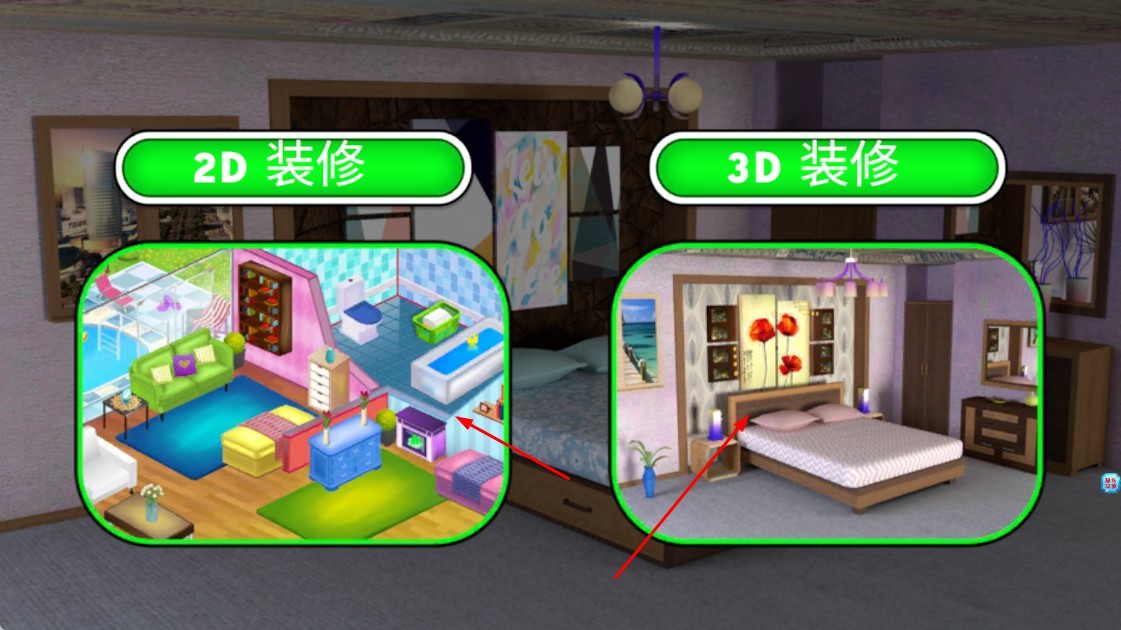1、進(jìn)入場(chǎng)景后選擇喜歡的房屋戶型,從公寓到別墅,確定需要裝修的房間區(qū)域,如客廳、臥室等。