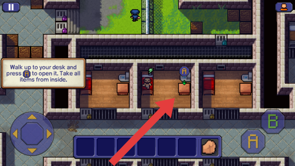 3、呈現(xiàn)了像素風格的監(jiān)獄場景,畫面中的提示引導玩家走到桌子前按鍵打開并拿走物品,這是收集資源的基礎操作。