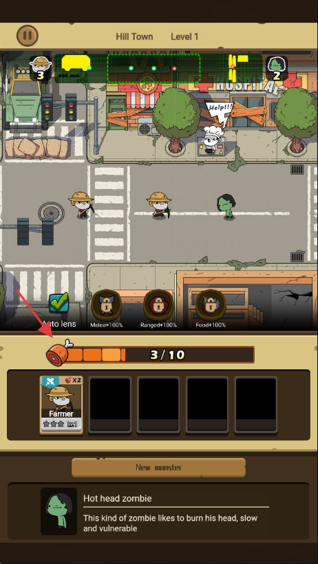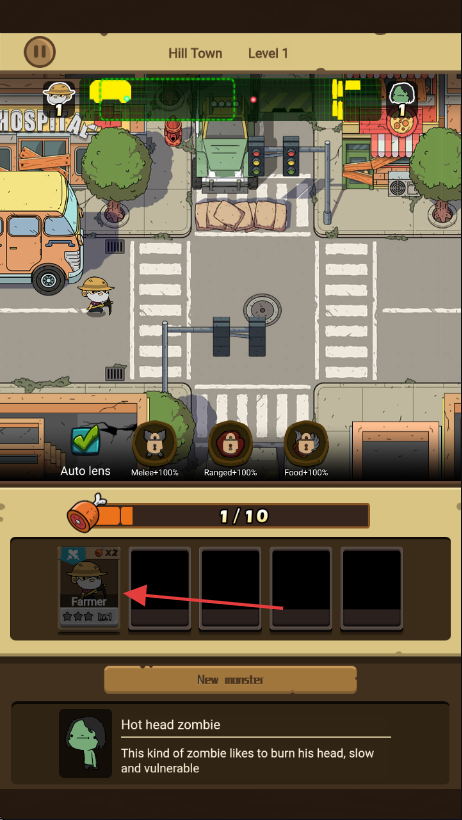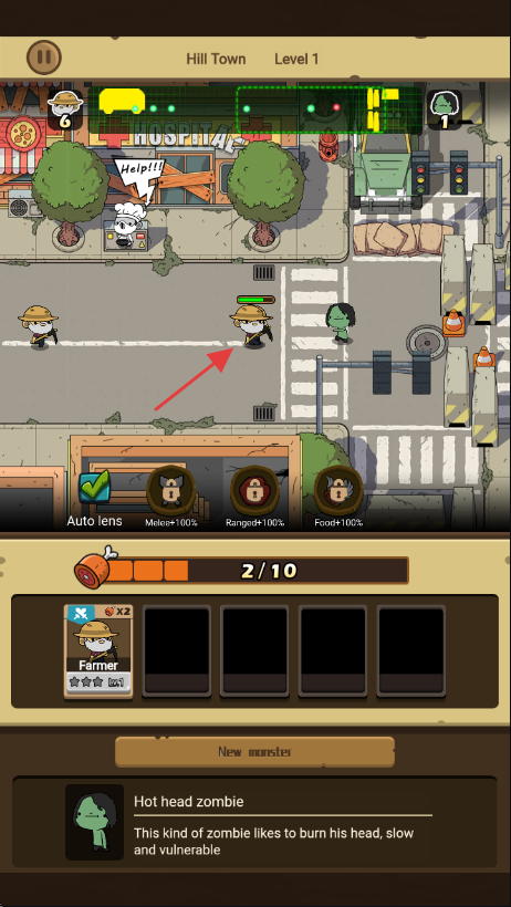 1、在【Hill Town Level 1】界面,點(diǎn)擊【Farmer】卡片準(zhǔn)備部署角色。