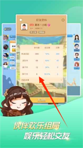 1、進(jìn)入界面查看好友資料,依據(jù)各項數(shù)據(jù)選擇伙伴,歡樂組局進(jìn)行互動。