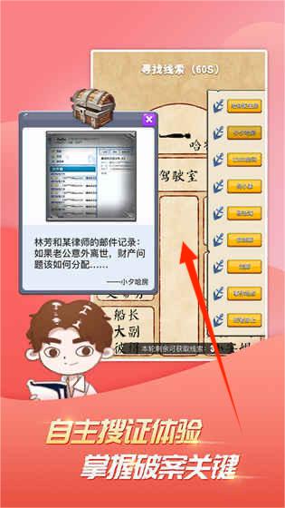 2、線索搜索推理:支持搜索線索與時間線,在不同場景仔細(xì)查找蛛絲馬跡,依據(jù)線索縮小目標(biāo)范圍,經(jīng)過兩輪搜證舉證,確定最終嫌疑人,考驗推理能力。