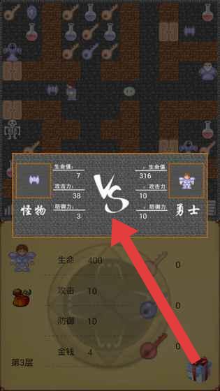 3、遇到怪物時,觸發(fā)戰(zhàn)斗界面(顯示怪物與勇士屬性對比),根據屬性計算戰(zhàn)斗結果,合理規(guī)劃戰(zhàn)斗策略以推進游戲。