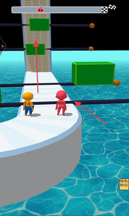 3、賽道上設有紫色柱子、綠色方塊等障礙,玩家要靈活操控角色躲避障礙,同時可利用賽道上的助力道具。