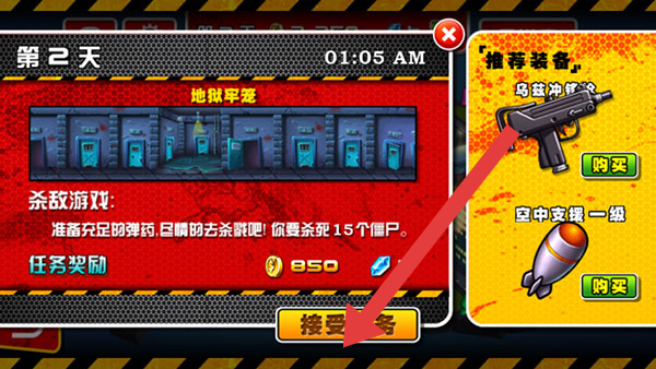 2、進(jìn)入任務(wù)界面,看到【第2天】的【地獄牢籠】任務(wù),明確殺敵要求后,點(diǎn)擊【接受任務(wù)】按鈕開(kāi)啟該關(guān)卡。