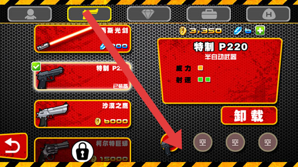 1、在武器裝備界面,可對(duì)【特制P220】等武器進(jìn)行操作,點(diǎn)擊裝備槽或【卸載】按鈕來(lái)調(diào)整武器裝備,為戰(zhàn)斗做好準(zhǔn)備。