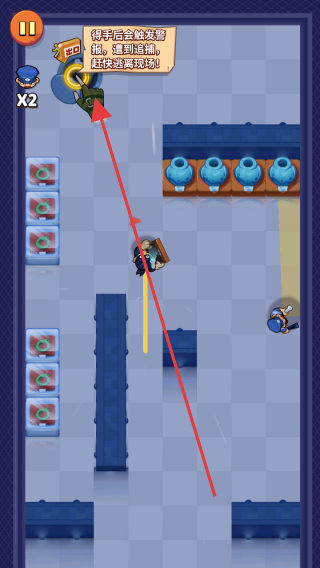 3、拿到名畫(huà)后,根據(jù)【得手后會(huì)觸發(fā)警報(bào),遭到追捕,趕快逃離現(xiàn)場(chǎng)!】提示,迅速操控角色向出口移動(dòng),躲避追捕,完成關(guān)卡任務(wù)。