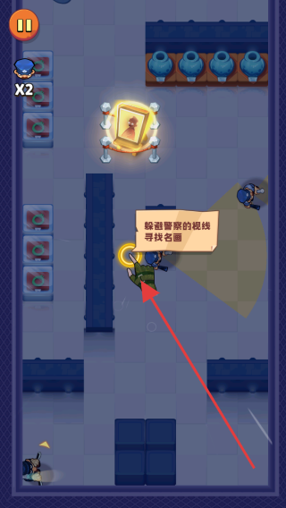 2、操控角色在場(chǎng)景中移動(dòng),依據(jù)【躲避警察的視線尋找名畫(huà)】提示,避開(kāi)警察視野,找到名畫(huà)所在位置。