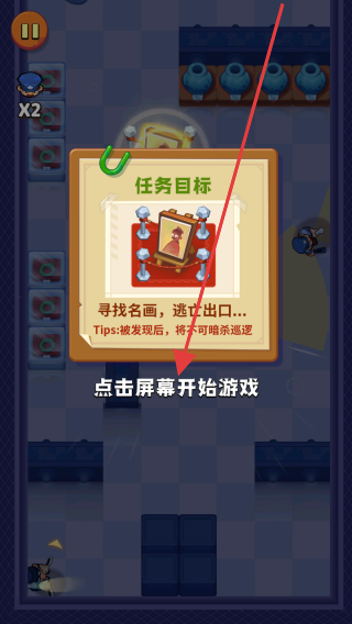 1、游戲開(kāi)始界面,看到【任務(wù)目標(biāo)】提示為“尋找名畫(huà),逃出出口...”,點(diǎn)擊屏幕開(kāi)始游戲,進(jìn)入冒險(xiǎn)環(huán)節(jié)。