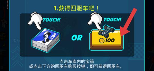 1、按提示點(diǎn)擊車庫內(nèi)寶箱或下方四驅(qū)車購買按鍵(如100金幣處),獲取四驅(qū)車,開啟游戲收集車輛環(huán)節(jié)。