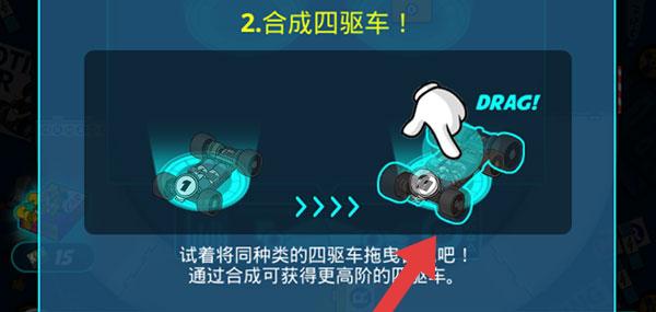 2、將同種類四驅(qū)車拖曳合成(按DRAG提示操作),通過合成提升車輛階數(shù),增強(qiáng)四驅(qū)車性能。