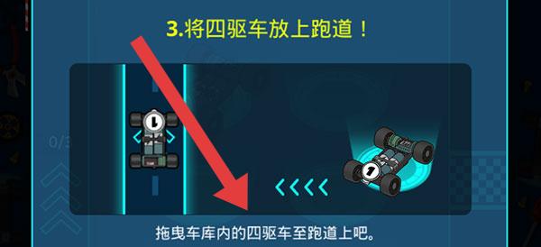 3、把車庫內(nèi)四驅(qū)車拖曳至跑道(按箭頭指示操作),將車輛放置到跑道上,準(zhǔn)備開始比賽。