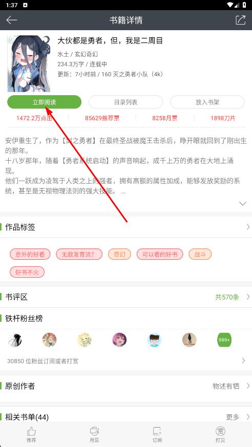 2、選擇心儀的書籍并點(diǎn)擊打開,閱讀前可以查看書評區(qū),查看網(wǎng)友們對書籍的評價(jià),點(diǎn)擊【立即閱讀】開始閱讀。