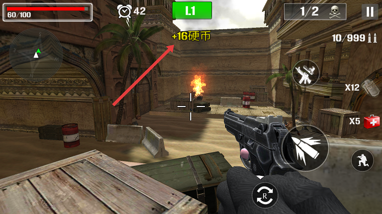 3、兩槍身體一槍頭,每殺一個(gè)敵人獎(jiǎng)勵(lì)16硬幣,以后可以在武器庫挑選更好的裝備。