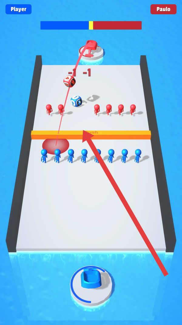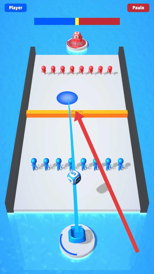 2、游戲中,操控藍色骰子按紅色箭頭方向移動,盡量讓骰子經過橙色區(qū)域,以獲得優(yōu)勢并撞擊對方紅色小人。