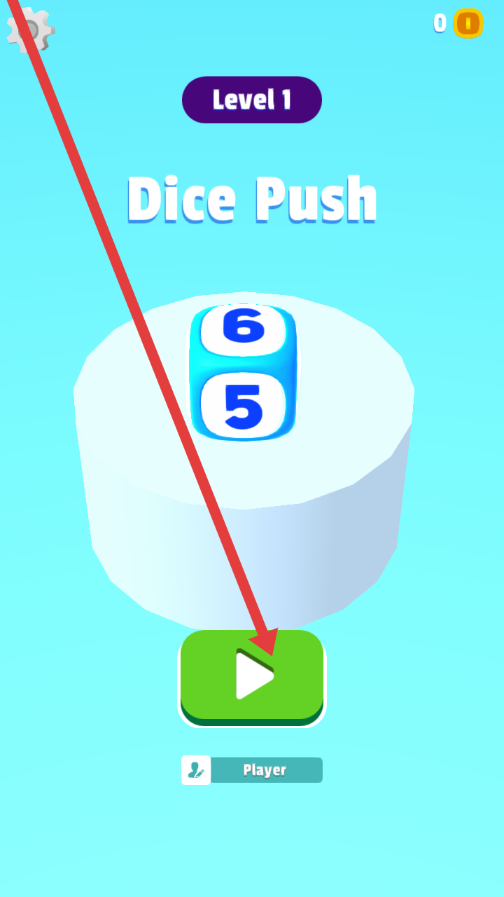 1、在游戲【Level 1】的【Dice Push】界面,按照紅色箭頭指示,點擊綠色播放按鈕進入游戲。