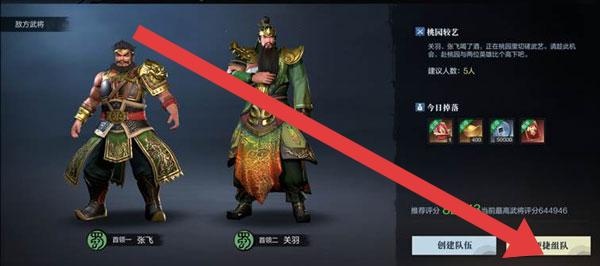 1、進入游戲,在組隊界面點擊【快速組隊】,快速匹配隊友,共同挑戰(zhàn)敵方武將(如張飛、關(guān)羽)。