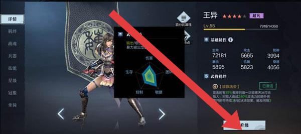 3、在角色界面(如王異),點擊【升級】按鈕,消耗資源提升角色等級,增加基礎屬性(攻擊、防御等)。