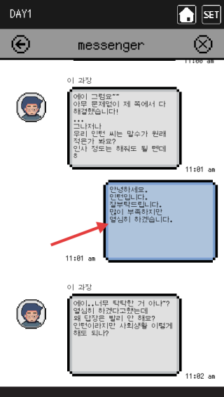 3、查看聊天界面中的韓文消息,根據(jù)內(nèi)容做出相應(yīng)決策或推進(jìn)劇情。