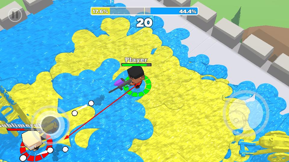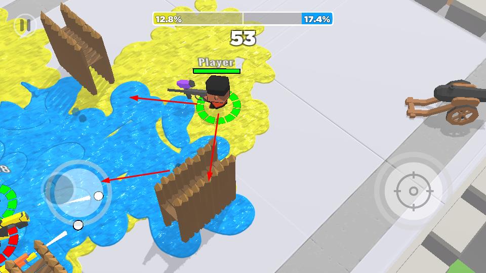 2、場(chǎng)景中有藍(lán)黃區(qū)域,玩家需在對(duì)戰(zhàn)同時(shí)爭(zhēng)奪場(chǎng)地控制權(quán),可能通過占領(lǐng)特定區(qū)域或擴(kuò)大己方顏色覆蓋范圍來獲取優(yōu)勢(shì)。