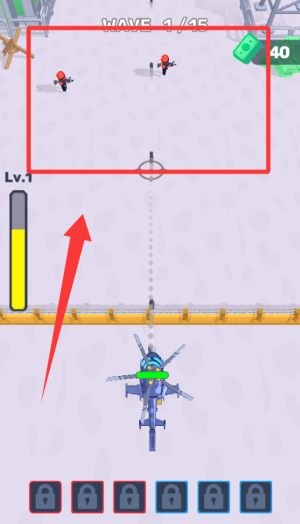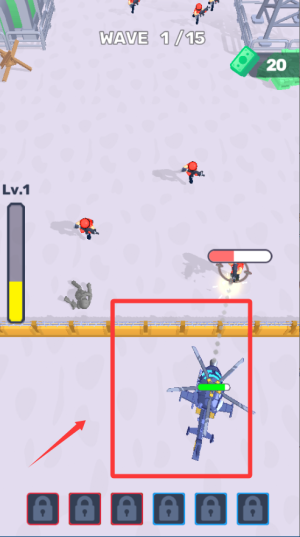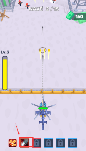 1、開局先熟悉直升機(jī)基礎(chǔ)操作,左右滑動(dòng)控制飛機(jī)調(diào)整射擊準(zhǔn)星,低空飛行時(shí)注意躲避障礙物。